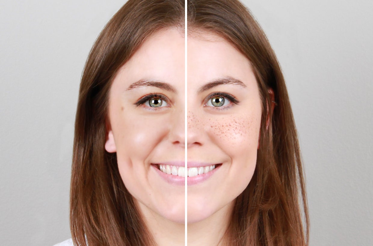 The trick? Give the freckles depth and dimension by using two different tones and pressing them into the skin randomly, alternating the pressure as you do so. Make them smaller and slightly darker on the nose, then a little lighter and larger across your cheekbones. Finally, use your ring finger to pat the skin and soften the dots.