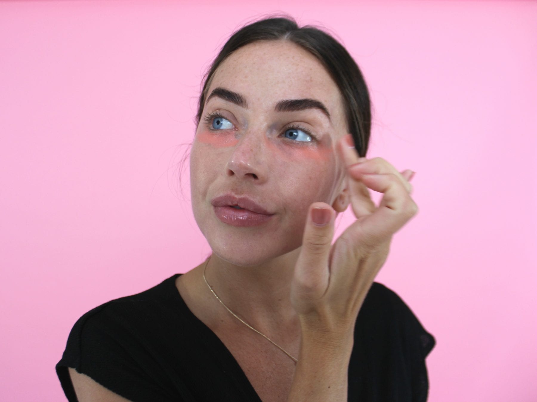 For blue-hued dark circles use a pink colour corrector to counteract the blue. Cream blushers are great for this. I used the Apicia Liquid Blush that you may remember from our January GLOSSYBOX and blended it over my dark circles using my fingers. This may look a bit crazy but trust me, it works.